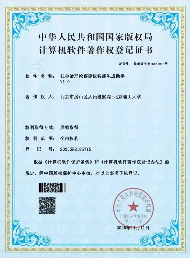北京理工大学法学院智慧法治实验室与房山区检察院共同研发的“社会治理检察建议智能生成助手”软件,已于2025年11月11日正式获得国家版权局颁发的《计算机软件著作权登记证书》,标志着学院在智慧法治领域的科研创新与成果转化取得重要突破,在“法律 + 智能”交叉创新领域建设发展取得实质成效。