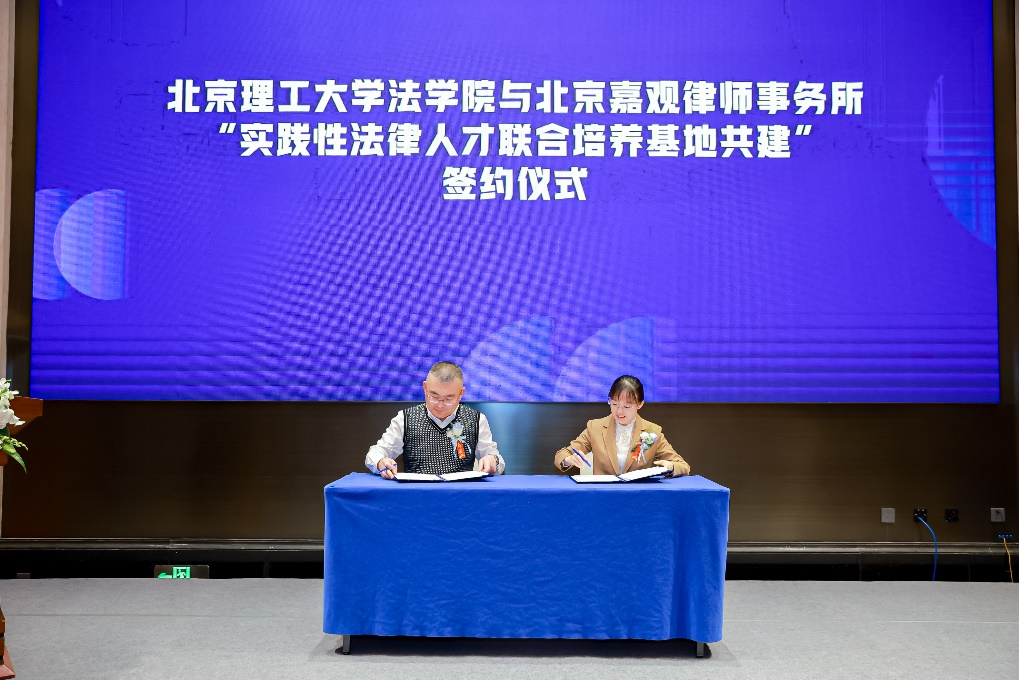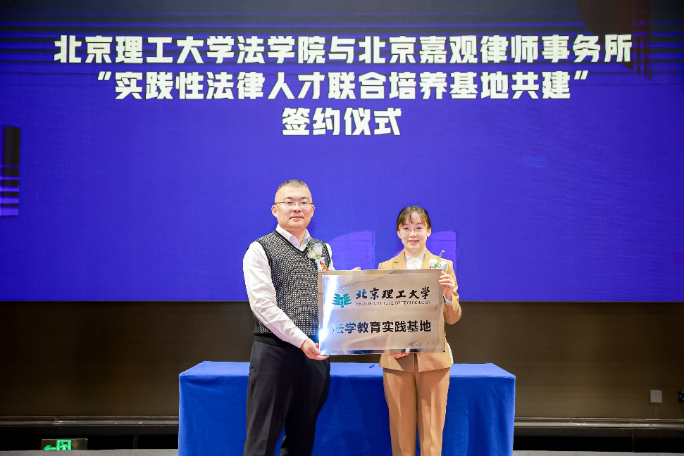 北京理工大学法学院与北京嘉观律师事务所举行“实践性法律人才联合培养基地共建”签约仪式。北京理工大学法学院副院长王福亮代表法学院向北京嘉观律师事务所主任韩雪授牌,并为北京嘉观律师事务所创始合伙人毕文胜律师颁发校外导师聘书。
