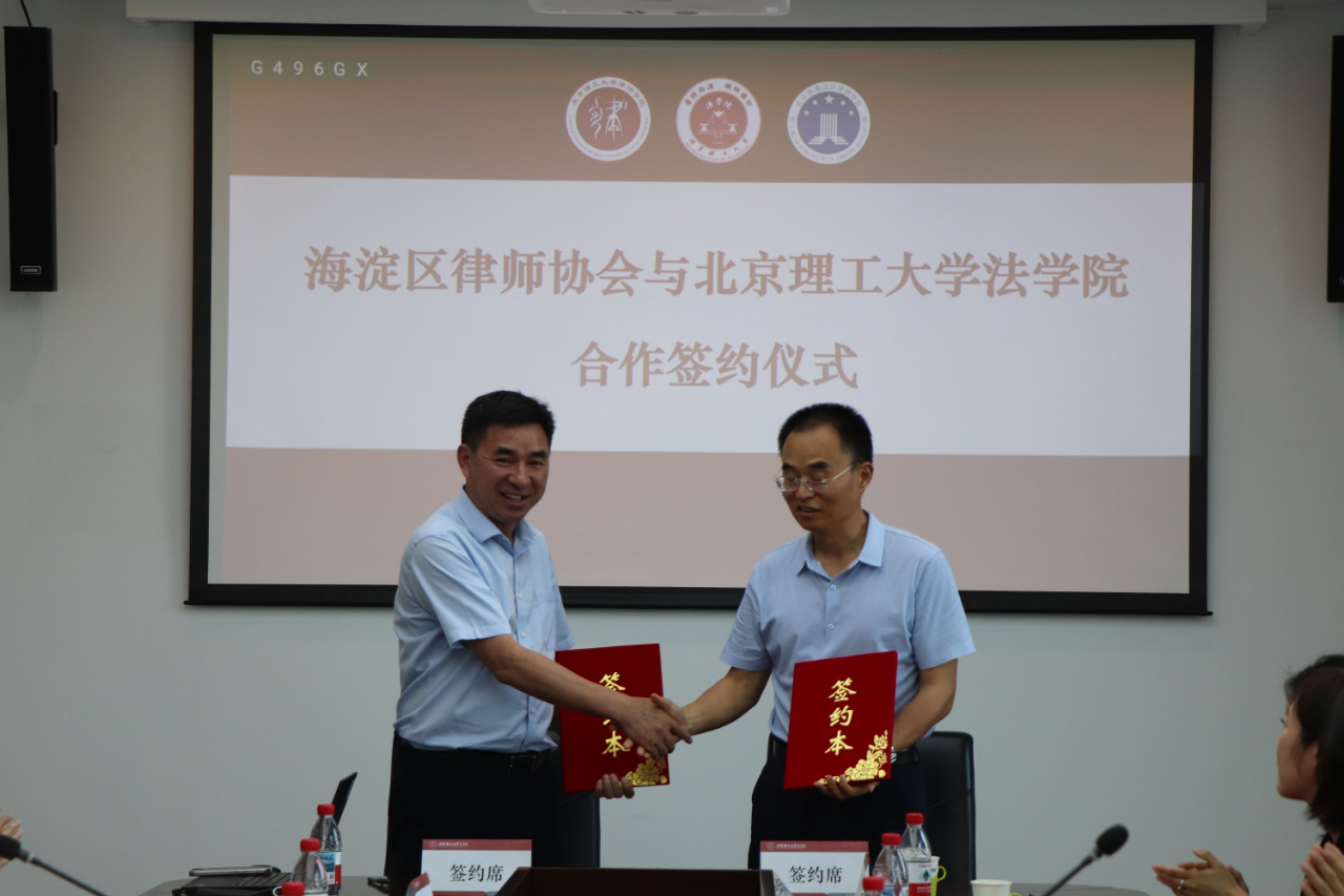 2025年6月18日下午,“法润京华——海淀区法律服务进高校”活动暨海淀区律师协会与北京理工大学法学院合作签约仪式在北理工举办。海淀区律师协会会长杨明,监事长毕文强,副会长韩雪、魏俊冰,副监事长李毅,文化宣传与品牌建设工作委员会主任刘思佳,求是公证处副主任周琦妍,海淀区司法局公共法律服务科科长李福军,普法与依法治理科科长张安静,北京理工大学法学院院长李寿平,党委书记刘存福,律师学院院长韩秀桃,法学院党委副书记、副院长兼律师学院执行院长马晓龙,副院长郭德忠、孙天全、张帅等出席签约活动。签约仪式由刘存福主持。