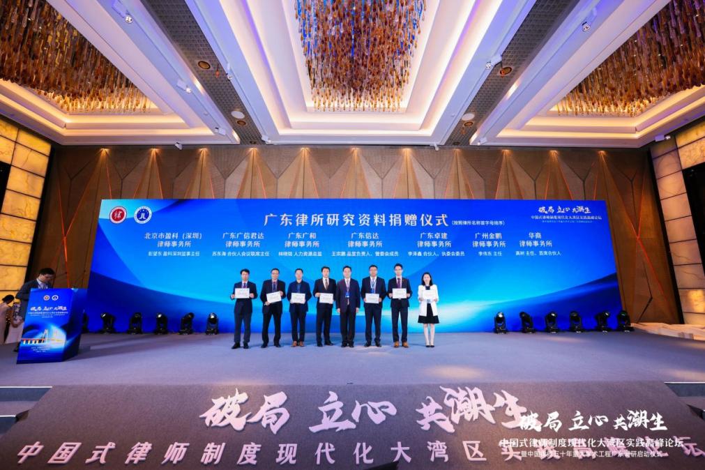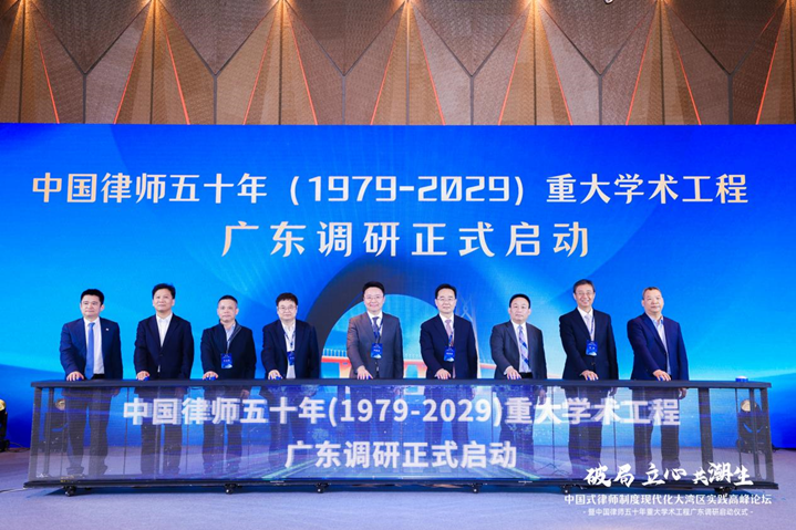 论坛上,北京理工大学律师学院院长韩秀桃教授,智合创始人、董事会主席、CEO洪祖运,北京大成(广州)律师事务所主任马章凯,广东德纳律师事务所主任陈峻峰,广东连越律师事务所主任刘涛,广东南方福瑞德律师事务所主任宋志斌,广东诺臣律师事务所主任周华章,广东卓信律师事务所主任陈健斌,国信信扬律师事务所党委副书记、纪委书记刘玉东,泰和泰(深圳)律师事务所运营总监刘峰共同启动中国律师五十年(1979-2029)重大学术工程广东调研。