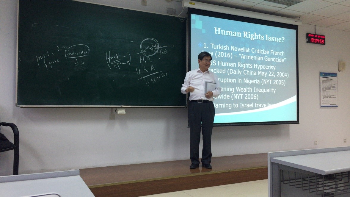 安京焕教授此次将在我校法学院进行为期三周的国际人权法讲学活动。在第一堂课上,安教授首先从整体上介绍了国际人权法的框架,随后则详细解释了国际人权运动的背景以及国际人权的发展历程。安教授还对 “印度童工泛滥现象”、“法国对学生宗教服装的强硬政策”等一系列案例进行了透彻地分析,启发和引导同学们思考其中的人权问题。在未来的课程中,安教授还将对国际人权保护机制、区域性人权保护机制、韩国宪法和韩国人权保护的情况等内容作详细介绍和讲解。