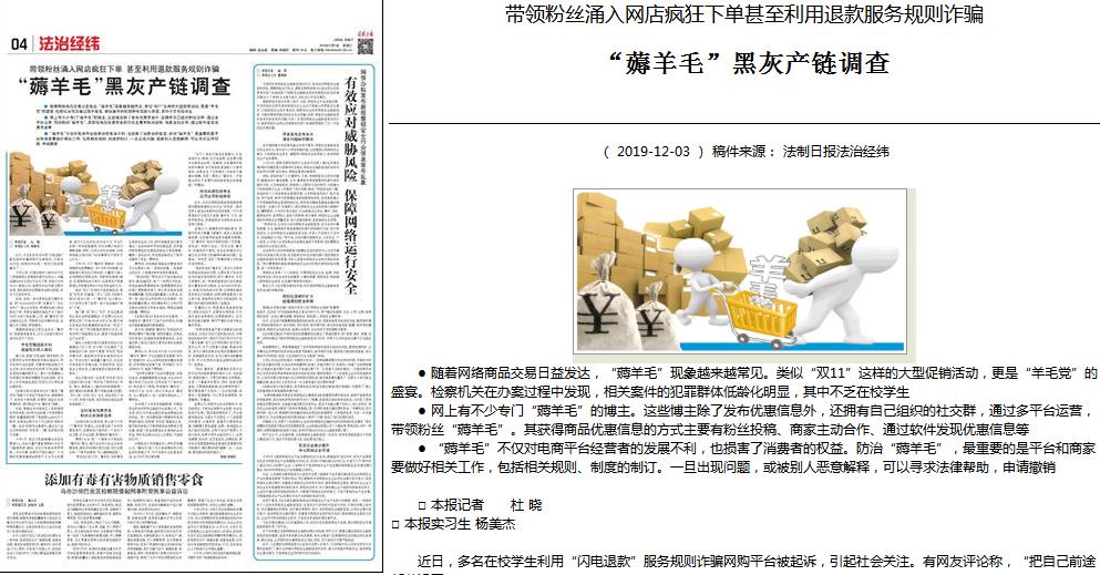 近日,我院孟强副教授就部分电商用户利用电商订单漏洞恶意下单的现象接受《法制日报》记者采访,稿件“带领粉丝涌入网店疯狂下单甚至利用退款服务规则诈骗 ‘薅羊毛’黑灰产链调查”刊登于《法制日报》2019年12月3日第4版“法治经纬”,以下为报道原文: