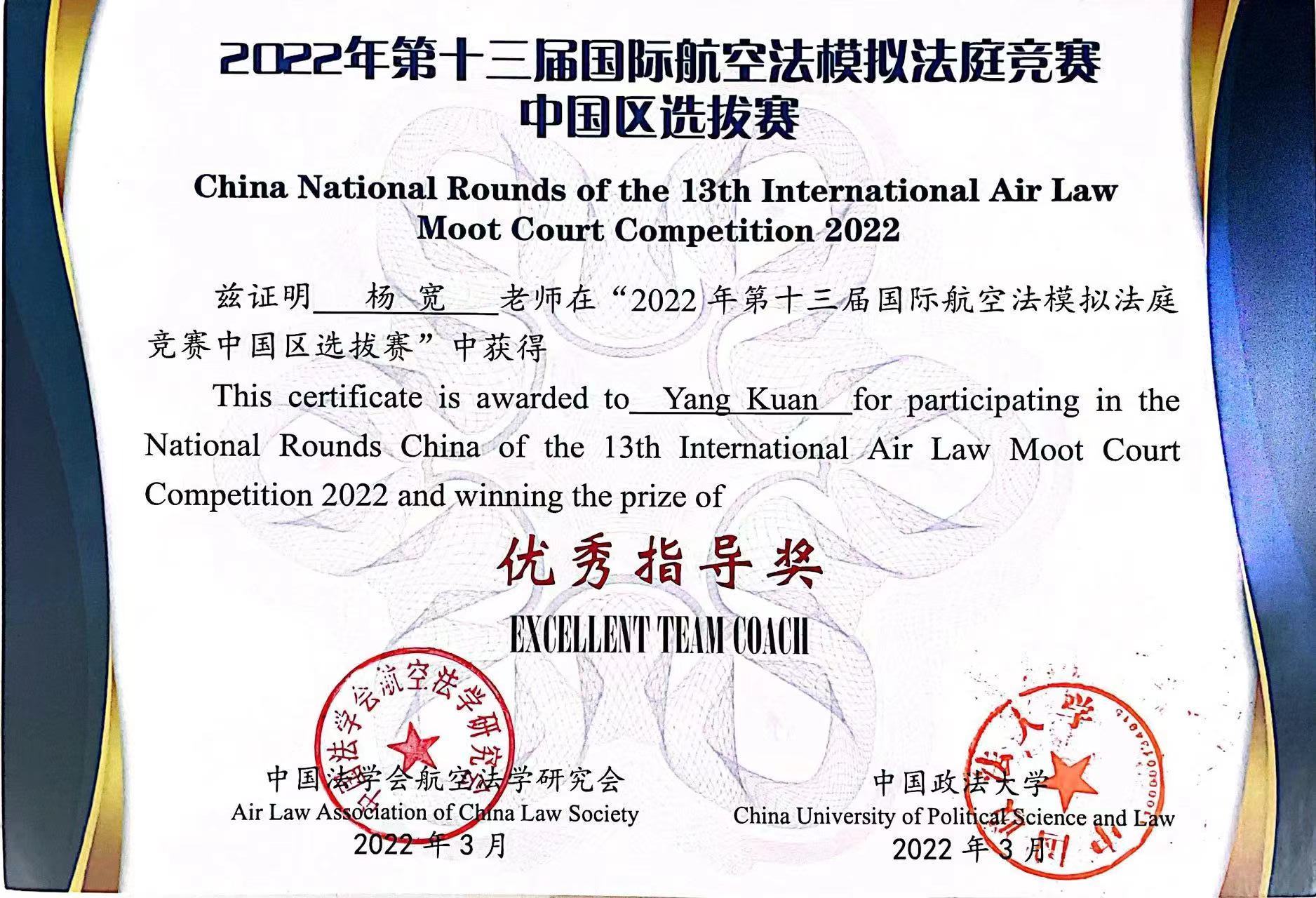 2022年3月,由中国法学会航空法学研究会、中国政法大学主办的第十三届“莱顿-塞琳”(Leiden-Sarin)国际航空法模拟法庭竞赛中国区选拔赛在北京举行,参赛队伍包括武汉大学、中国政法大学、华东政法大学、北京航空航天大学、中国民航大学等。经过两天激烈角逐,我校代表队荣获团体二等奖,法学院杨宽老师获优秀指导奖。
