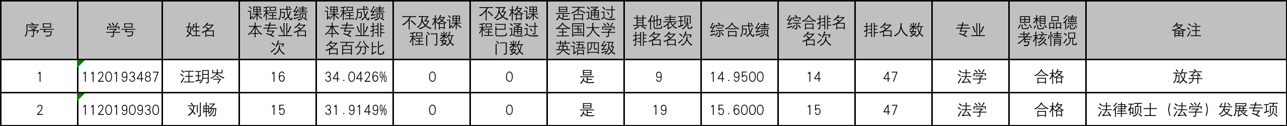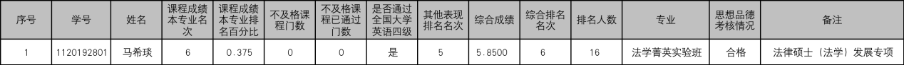 根据教育部《关于进一步规范和加强推荐优秀应届本科毕业生免试攻读研究生工作的通知》(教学厅函【2020】12号)等推免工作文件精神,以及《关于做好北京理工大学2023年推荐优秀应届本科毕业生免试攻读研究生工作的通知》、《关于北京理工大学2023年推荐优秀应届本科毕业生免试攻读研究生工作发展专项推免生遴选推荐的指导性意见》的相关规定,执行《北京理工大学法学院2023年推荐免试攻读硕士研究生工作实施细则》、《北京理工大学2023年推荐优秀应届本科毕业生免试攻读研究生工作法学院法律硕士(法学)发展专项推免生遴选推荐工作细则》,将法学院2023年法律硕士(法学)发展专项的推荐免试攻读研究生候选人名单公示如下: