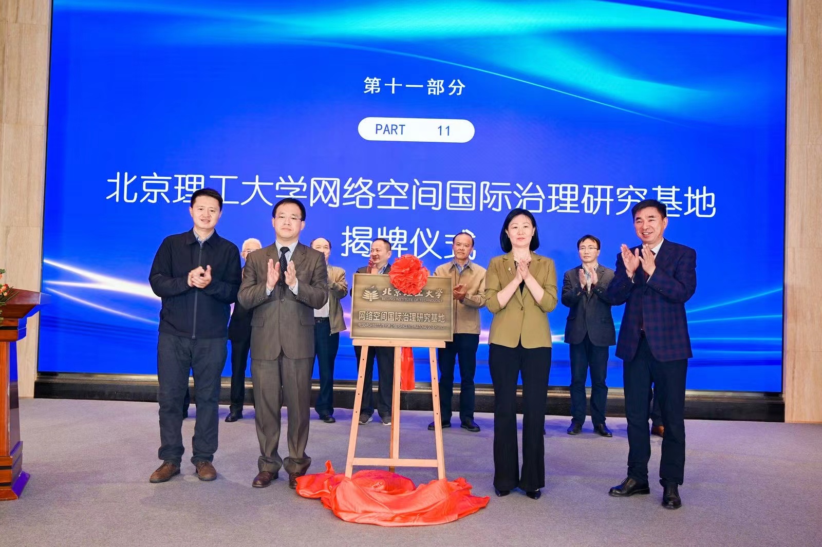 最后,进行了北京理工大学网络空间国际治理研究基地揭牌仪式,与会嘉宾进行了揭牌及合影。