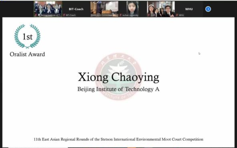 2022年11月22日-26日,第27届国际环境法模拟法庭大赛(International Environmental Moot Court Competition,IEMCC)东亚赛区选拔赛(East Asia Regional Round)在韩国崇实大学(Soongsil University)举行。北京理工大学法学院代表队一路过关斩将,克服疫情防控下的不便,在韩国延世大学、加德满都大学、武汉大学、中国政法大学等一众国际知名高校中脱颖而出,凭借扎实备赛功底与场上精彩表现同时斩获原被告双方二等最佳书状奖与一等最佳辩手奖。