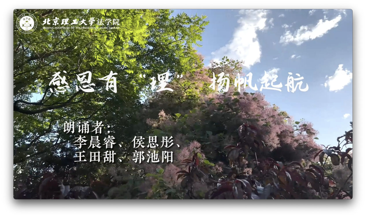 今年夏天,疫情虽然阻挡了毕业生返校的步伐,却无法阻挡同学间温情的传递。2022届毕业生在“法毓青春”祝福视频以及“感恩有理”朗诵视频中,回顾了求学北理工法学院的美好时光,声情并茂地表达了他们对学校和学院的热爱、对老师们的感激和对同学们的不舍。