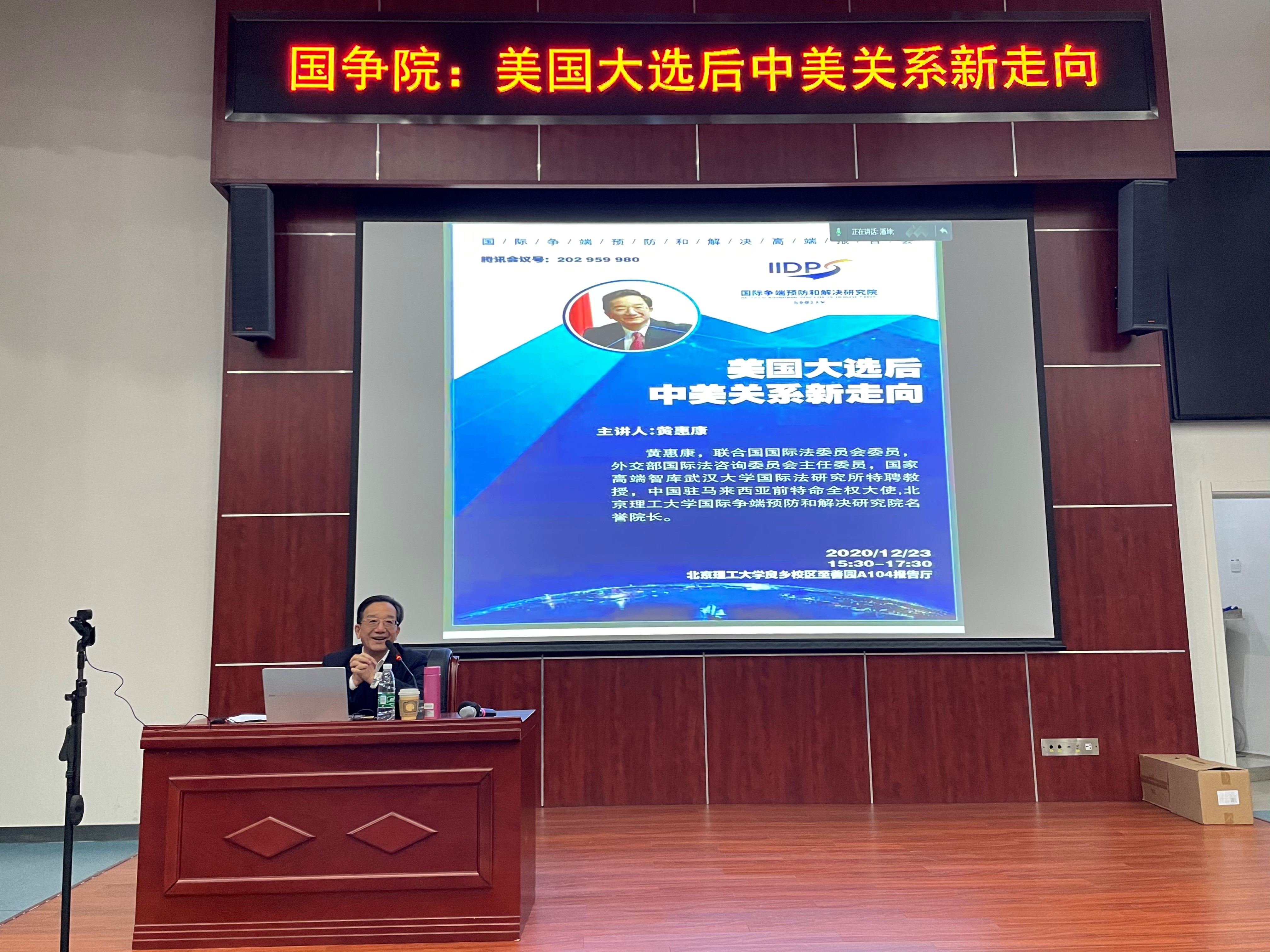 2020年12月17日下午,应北京理工大学国际争端预防和解决研究院执行院长杨成铭教授的邀请,联合国国际法委员会委员、外交部国际法咨询委员会主任委员、国家高端智库武汉大学国际法研究所特聘教授、中国驻马来西亚前特命全权大使、北京理工大学国际争端预防和解决研究院名誉院长黄惠康先生以“美国大选后的中美关系新走向”为主题为法学院师生做了一场精彩的讲座。本次讲座在良乡校区综合教学楼一层报告厅举行,由杨成铭教授主持。