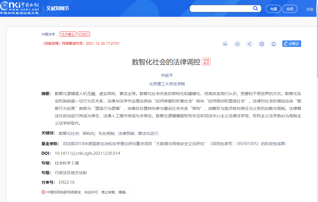 近日,北京理工大学法学院齐延平教授在中国法学领域三大核心期刊之一的《中国法学》发表题为“数智化社会的法律调控”的论文。该论文系司法部2018 年度国家法治和法学理论研究重点项目“大数据与网络安全立法研究”(项目批准号:18SFB1005)的阶段性成果。