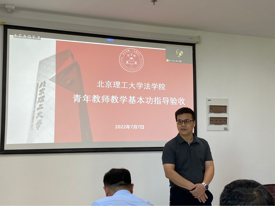 为进一步加强法学院青年教师队伍建设,引导青年教师锤炼教学基本功,提升教学业务能力与水平,2022年7月7日上午,法学院于良乡校区文教北廊举办了2022年青年教师教学基本功展示活动,活动以线上线下结合的方式进行。法学院院长李寿平、党委书记张瑜、副院长郭德忠、副院长孙天全、教学名师齐延平教授、罗丽教授、龚向前教授作为点评嘉宾出席活动,青年教师陈姿含、裴轶、陈明辉、杨宽参加活动。活动由法学院党委副书记、副院长马晓龙主持。