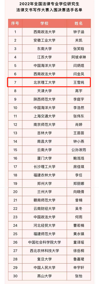 近日,由中国法学会法学教育研究会主办,全国法律专业学位研究生教育指导委员会指导,厦门大学法学院承办的2022年全国法律专业学位研究生法律文书写作大赛在厦门大学圆满落幕。北理工法学院2021级法律硕士王雪纯同学在3659名选手中脱颖而出,成功闯入决赛,荣获优秀奖。