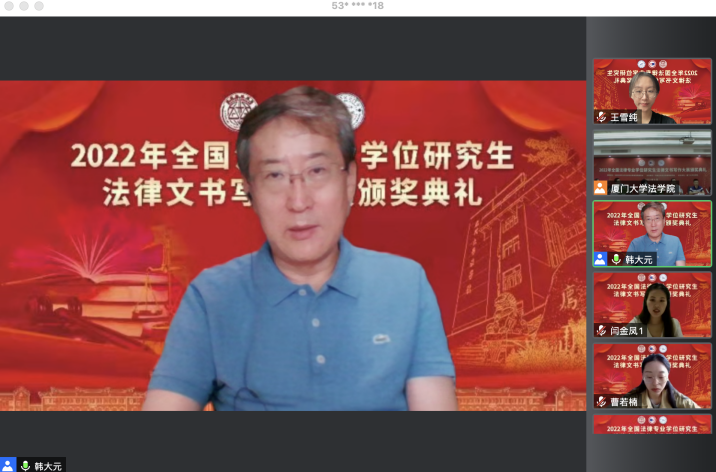 6月12日的颁奖典礼上,由厦门大学法学院院长宋方青教授进行致辞后,中国法学会法学教育研究会常务副会长韩大元教授围绕当代社会进行法律文书写作的意义、法律智能化发展能否取代人工实现优质法律文书的撰写等内容发表致辞,中国法学会法律文书学研究会会长马洪俊教授围绕法律文书在司法实践中的作用及如何写好法律文书进行了主题发言,西南政法大学法学院张武举副教授对于决赛选手作品进行了细致点评,最后由全国法律专业学位研究生教育指导委员会副秘书长时延安教授对于本次大赛进行总结讲话。