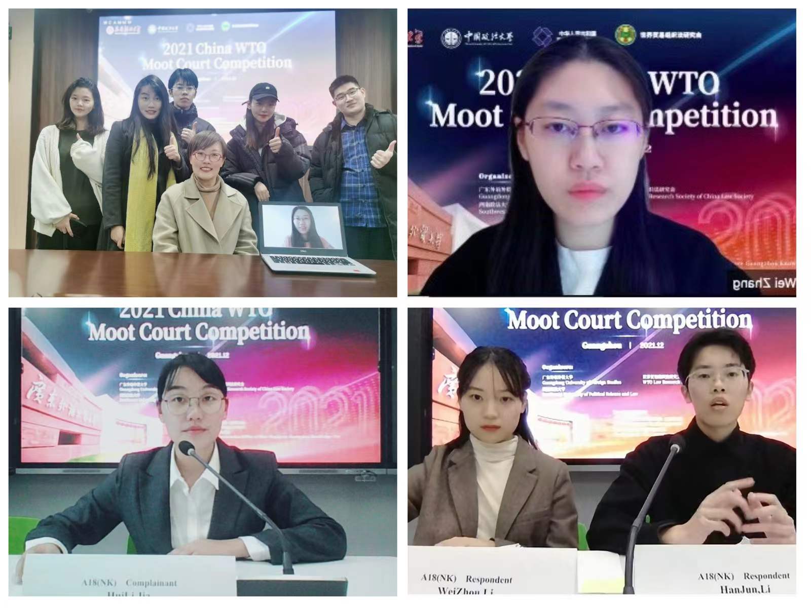 (左上)李华老师与学生团队合影(右上)申请人方辩手张维比赛截图