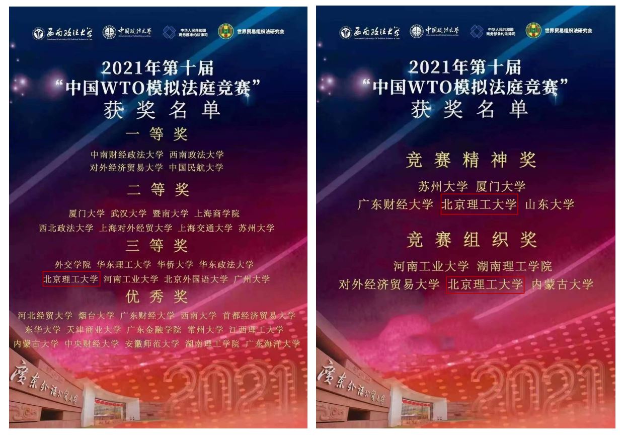 2021年12月19日,第10届“中国WTO模拟法庭”竞赛圆满落下帷幕。北京理工大学法学院代表队首次参与该项赛事,在全国39支高校代表队的激烈角逐中,李华老师指导,研究生张维、贾慧丽、李寒俊、李维周担任辩手的团队荣获团体三等奖、竞赛精神奖和竞赛组织奖。