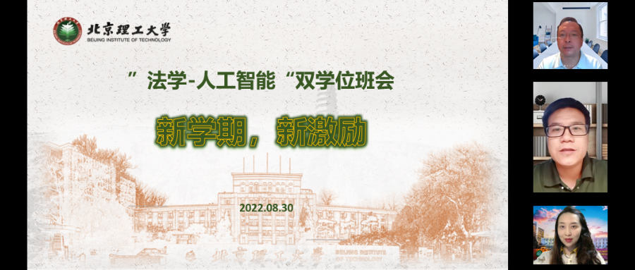 2022年8月30日,法学院“法学-人工智能”双学位班21级秋季开学班会暨座谈会顺利举行,会议采取线上腾讯会议的形式。北京理工大学法学院党委副书记副院长马晓龙、副院长郭德忠、“法学-人工智能”双学位班班主任裴轶、本科教学干事杨佳美出席会议,21级“法学-人工智能”双学位班全体同学参加会议。