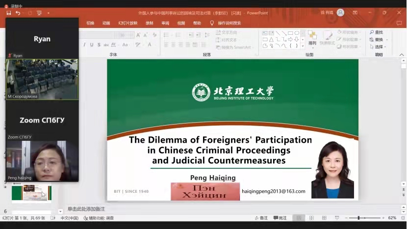 北京时间2022年11月16日19点20分至20点50分,北京理工大学法学院彭海青教授应邀为俄罗斯圣彼得堡国立大学学生讲授第一次线上学分课《外国人在中国参与刑事诉讼问题》,彭海青教授从外国人在中国的犯罪现状、中国应对外国人犯罪的相关刑事诉讼规范与实践、中国办理外国人犯罪案件的刑事诉讼程序困境、未来中国刑事法律应对外国人犯罪案件的发展方向等四个方面进行讲解。