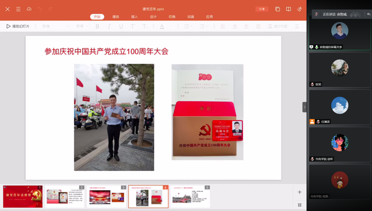 随后发言的是中国政治青年学院的余智威同学,他分别就观看建党百年文艺演出和参加建党百年大会分享的自己的感悟。在观看文艺演出方面,他表示当全场2万名观众热血沸腾的齐唱《唱支山歌给党听》时,仿佛百年征程历历在目,深受震撼。在参加建党百年大会时,他表示即便当天略有微雨,但全场参会人员依旧全神贯注、聚精会神的聆听着习近平总书记的讲话,深受鼓舞,精神振奋。全场山呼海啸般的掌声令他难忘,俞智威最后表示:请党放心,强国有我!