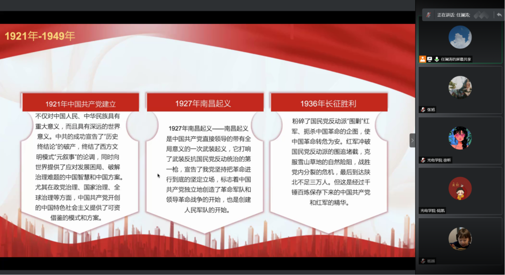 随后任澜涛同学以重大时间节点为分割线,分别就1921年—1949年、1949年—1978年、1978年—2012年、2012年—2021年四个时间段的大事件进行介绍和讲解。以回顾建党百年光辉历程的方式分享了他对习近平总书记“七一”重要讲话的理解和感悟。