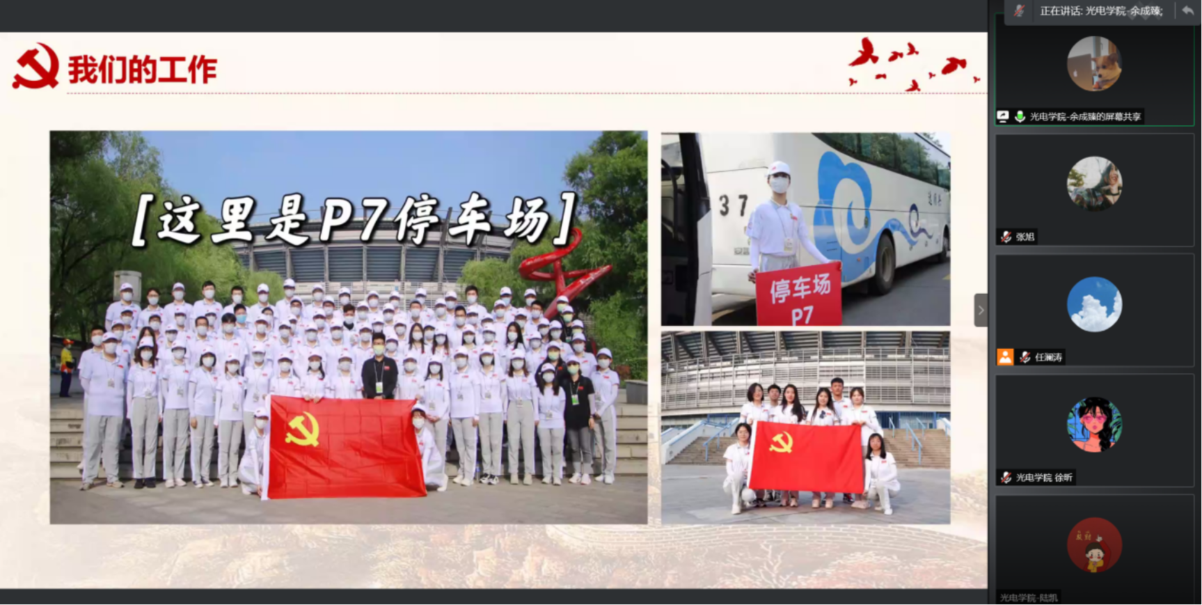 本次党日活动分为两项流程。第一项流程为邀请三位亲历建党百年活动现场的同学分享活动感悟。第二项流程为法学院研究生第四党支部书记任澜涛带领成员学习百年党史。