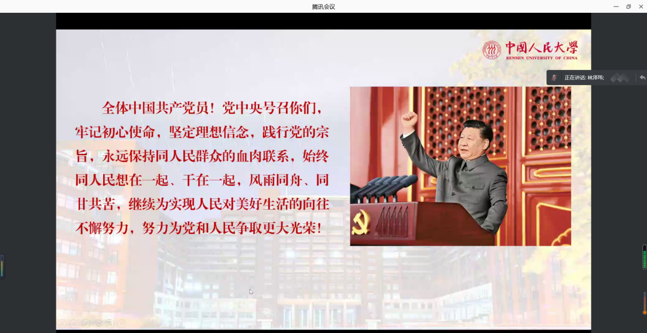 首先发言的是中国人民大学的林泽玮同学,他从自身理解角度解读了习近平总书记七一讲话中的9个“同志们、朋友们”,分别是“一个宣告、一个主题、一种精神、三次致敬、九个必须、一项事业、一份嘱托、一个号召和两个万岁,以及中国共产党为什么能成功?中国共产党怎样才能继续成功?”的两个回答。随后他表示能够参加庆祝中国共产党成立100周年大会,承载先辈们的信念,有幸见证如他们所愿的百年圆梦时刻。林泽玮最后表示:让我们继续担起他们的期盼,昂首阔步走向下一个百年辉煌。