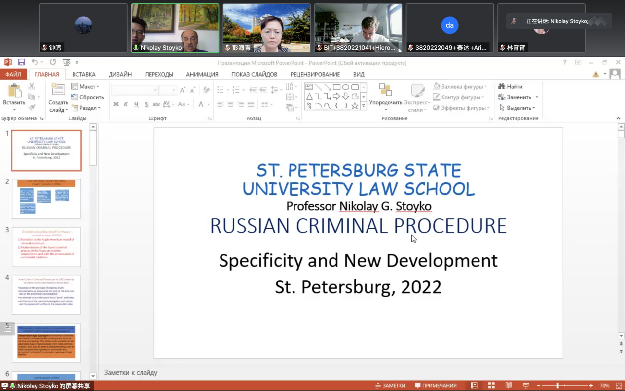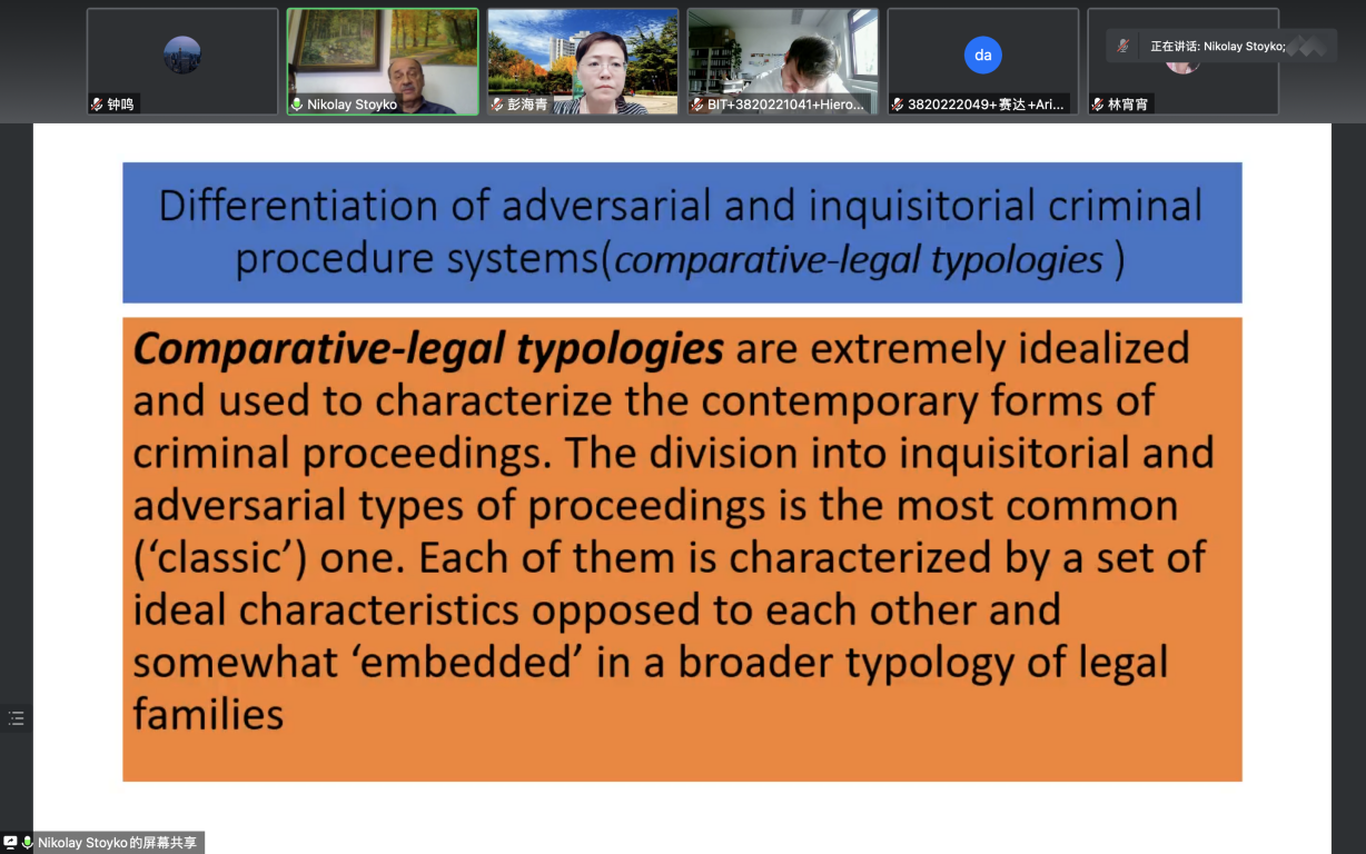 2022年10月5日晚,圣彼得堡国立大学的Nikolay G.Stoyko教授应邀作客“比较诉讼制度”课堂,为北京理工大学法学院的研究生们介绍了“俄罗斯刑事诉讼程序的特殊性和新发展”,来自中国、德国、俄罗斯等国的在读研究生20多人参与。