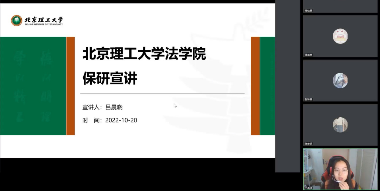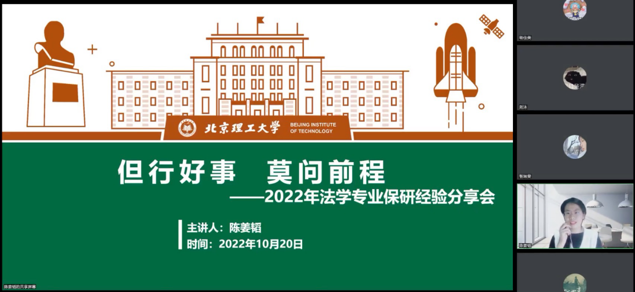 2022年10月20日,法学院双学位保研经验分享会在良乡校区文萃楼I102顺利举办,此次分享会同步进行线上直播。本次保研分享会主要面向2021级、2022级“法学-人工智能”双学士学位特色培养项目的本科生,分享主题为修读双学位在保研过程中的优势与竞争力,以及如何在本科一二年纪做好前期规划与准备。分享会由“法学-人工智能”双学位班班主任裴轶老师主持,邀请了我院4名顺利保研到北京大学、中国政法大学、华东政法大学、北京理工大学等国内知名高校的优秀学生,向大家介绍保研路上的相关经验。