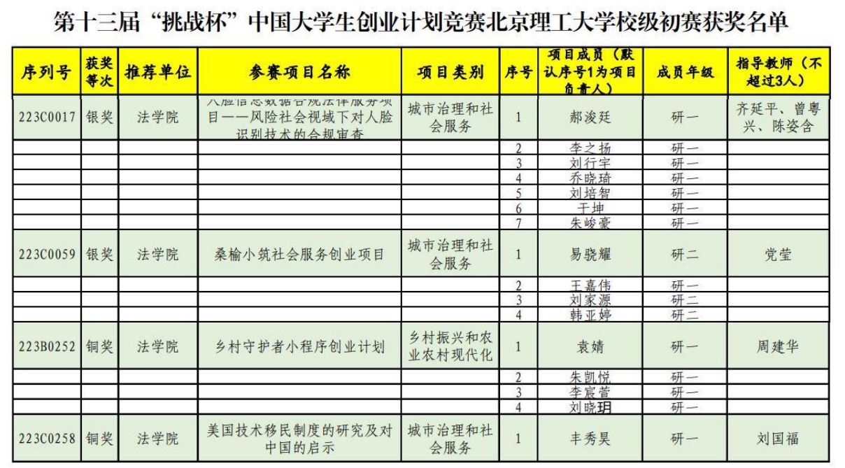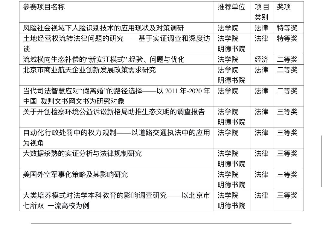 北京理工大学法学院利用法学院特色的“国际法学”“智能科技法”两个特色大团队,智能科技风险法律防控工信部重点实验室、人工智能法学教育实践基地与国家人权教育与培训基地大平台,充分发挥“科技+法律”的融合优势和国际法学科优势,依托学院教师队伍的国家社科基金项目等优秀课题,结合实践,重点培养法学领域的北理工文科特色双创项目,在师生团队的共同努力下,孵化培育了一批学生可独立开展研究的项目。2022年法学院学生双创竞赛成绩进一步提升,喜获佳绩。