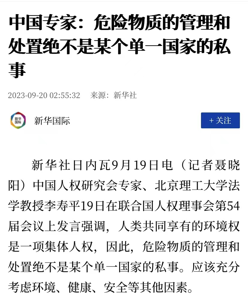 李寿平呼吁国际社会和联合国特别报告员重点关注这个问题,对核污水排海的管理及责任问题进一步讨论。