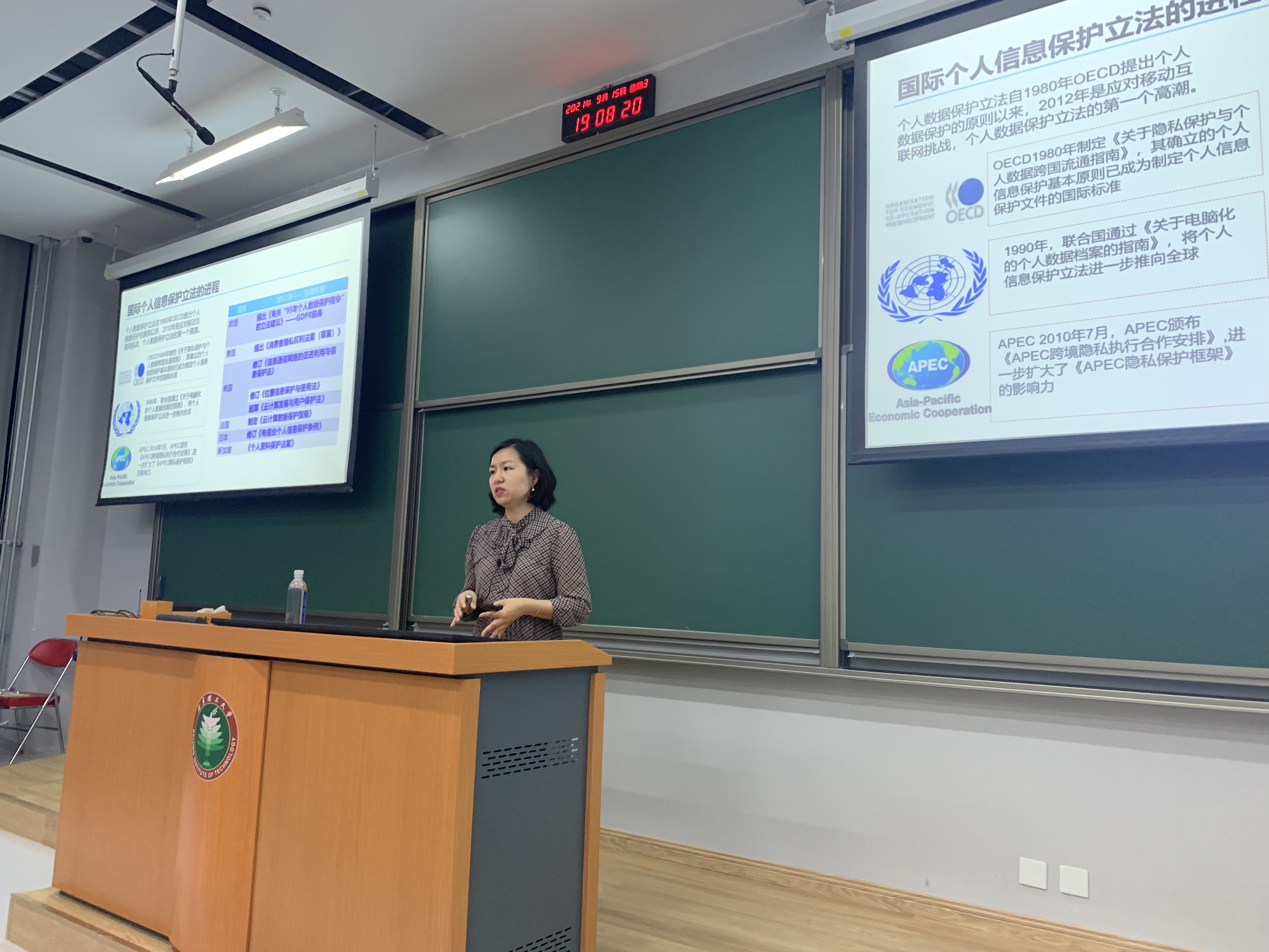 2021年9月15日晚上,理公明法课堂第118讲 “个人信息保护法与数字经济立法的未来”在北京理工大学良乡校区东区文一楼140教室成功举办。这是为全日制法学硕士和法律硕士开设的《法学前沿专题》课程在本学期的第一讲。本次课程主讲人为蚂蚁科技集团股份有限公司隐私保护办公室资深专家,中国信息通信研究院互联网法律研究中心原主任李海英女士,主持人为北京理工大学法学院法学博士后王磊。
