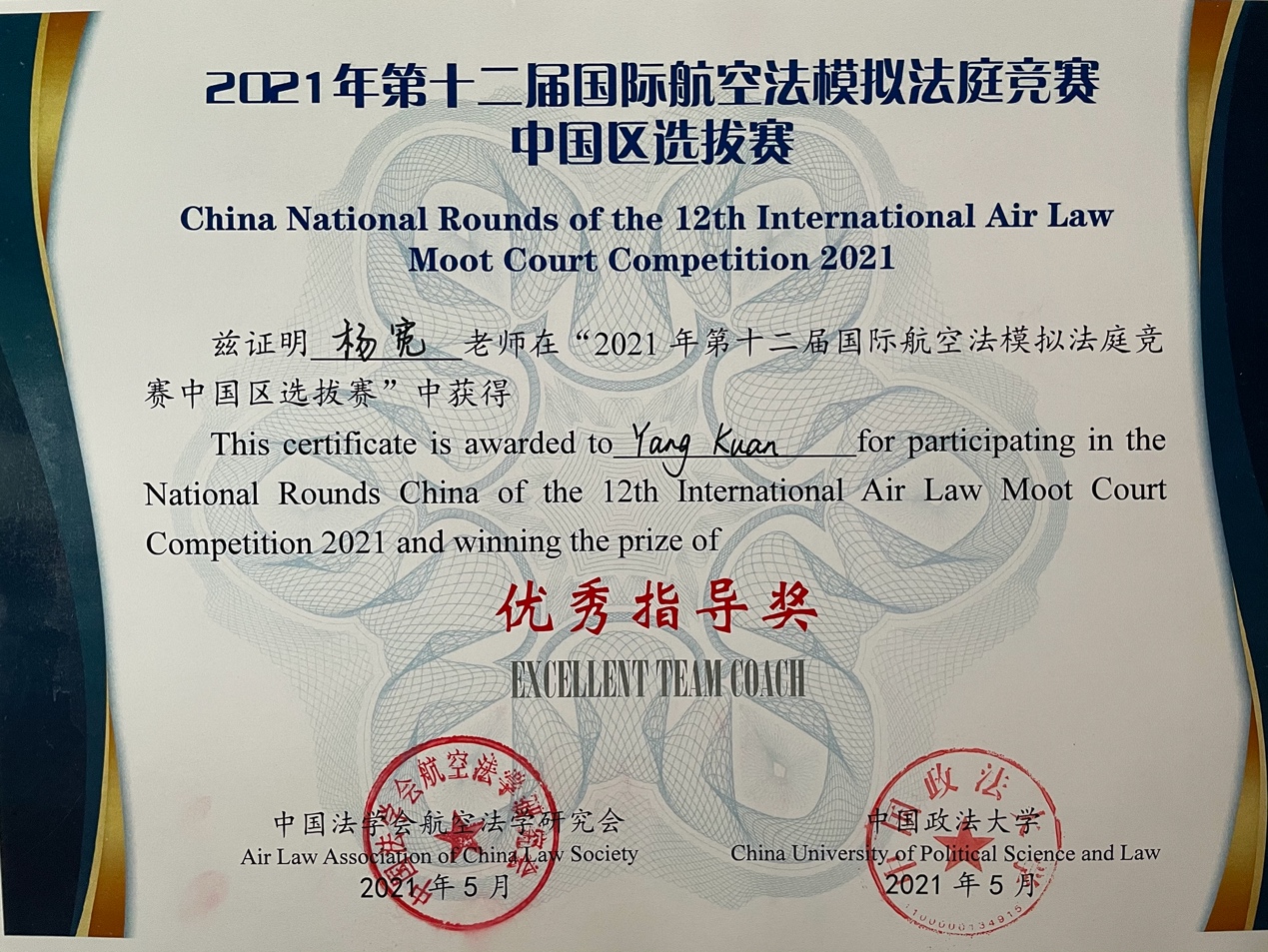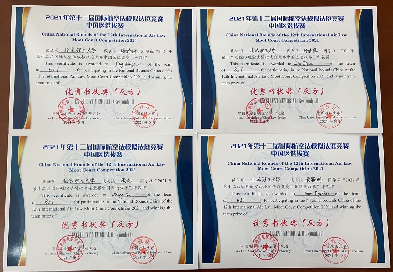2021年4月,由中国法学会航空法学研究会、中国政法大学主办的第十二届“莱顿-塞琳”国际航空法模拟法庭竞赛中国赛在北京举行。此次竞赛以线上形式进行,北京理工大学、中国政法大学、北京航空航天大学、武汉大学、华东政法大学、中国民航大学、北方工业大学等高校代表队参与竞赛。经过两天激烈角逐,北理工代表队荣获竞赛三等奖、优秀书状奖(反方),法学院杨宽老师荣获优秀指导奖。