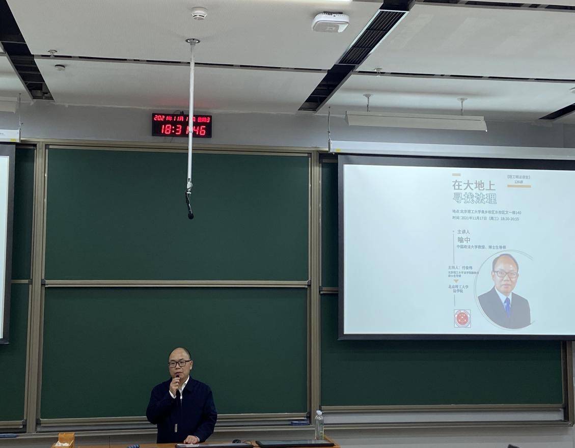 2021年11月17日晚,理公明法课堂第126讲“在大地上寻找法理”在北京理工大学良乡校区东区文一楼140教室成功举办。这是为全日制法学硕士和法律硕士开设的《法学前沿专题》课程在本学期的第九讲。本次课程的主讲人是中国政法大学教授、博士生导师喻中老师。主持人为北京理工大学国际争端预防和解决研究院副院长付俊伟副教授。