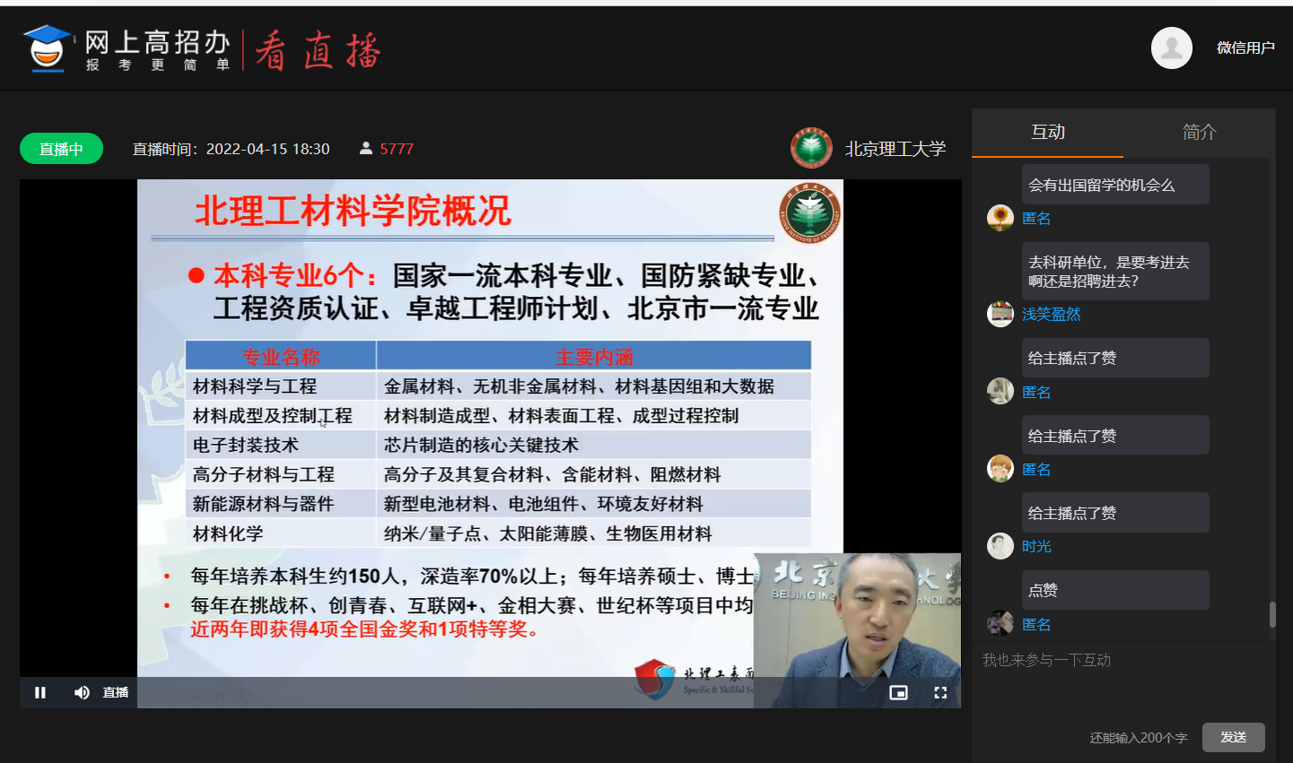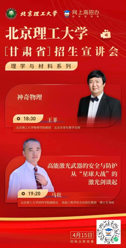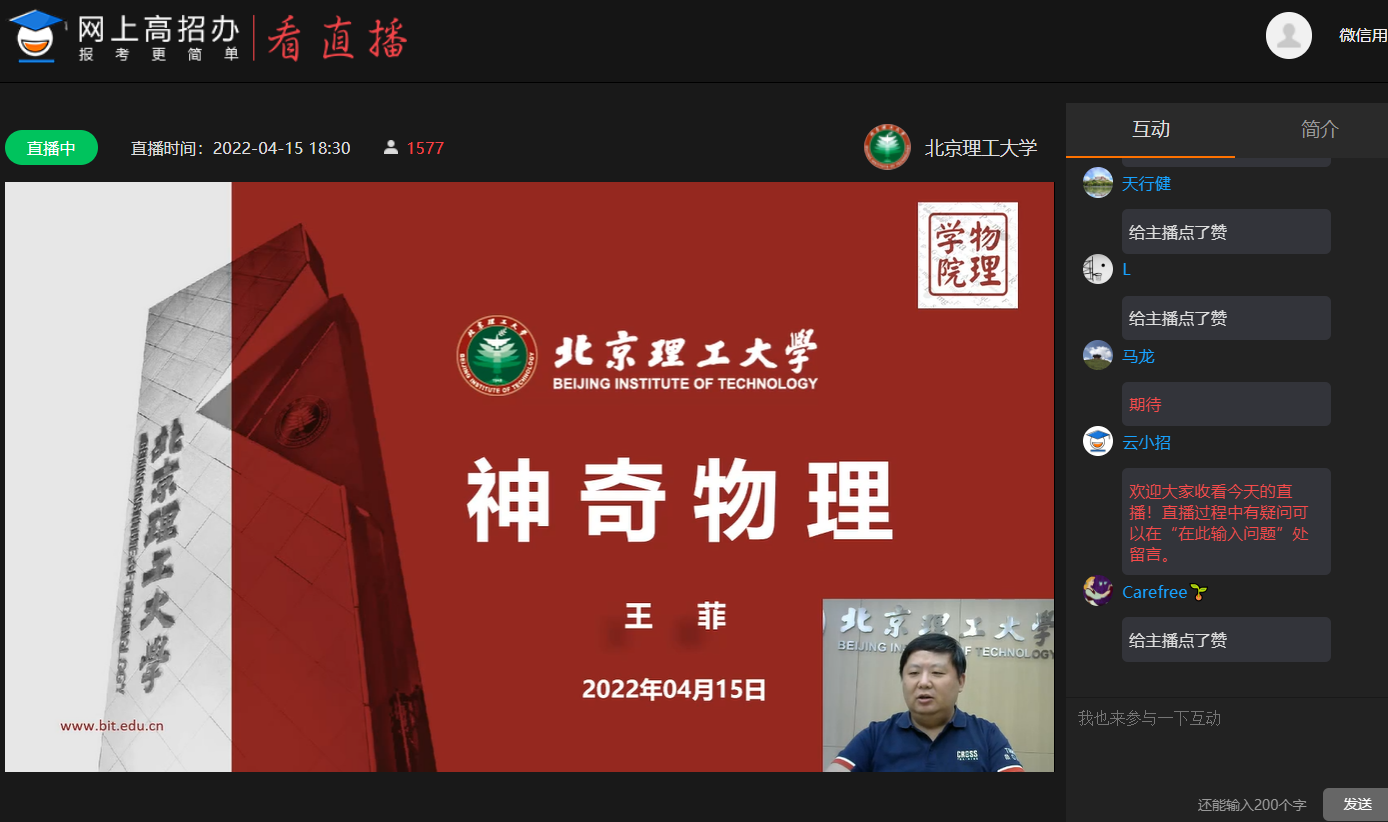 为方便甘肃省广大考生和家长深入了解北京理工大学、激发学生的学习兴趣,进一步扩大学校在甘肃省的知名度和影响力,4月15日晚,甘肃招生组举办了“理学与材料大类专业”专场宣讲会。物理学院教授王菲、材料学院教授马壮、甘肃招生组马晓龙共同通过网上高招办平台与考生和家长见面和答疑,约6000名家长、考生在线观看。