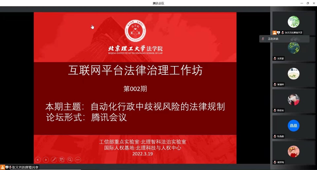 3月19日,由智能科技风险法律防控工信部重点实验室和国家人权教育与培训基地北京理工大学科技与人权研究中心共同主办的“互联网平台法律治理工作坊”第二期学术活动通过腾讯会议线上召开。本次会议的主题是“自动化行政中歧视风险的法律规制”,主要内容是就张文芳博士的开题报告进行研讨交流。中国海洋大学副教授曹晟旻主持本次会议。