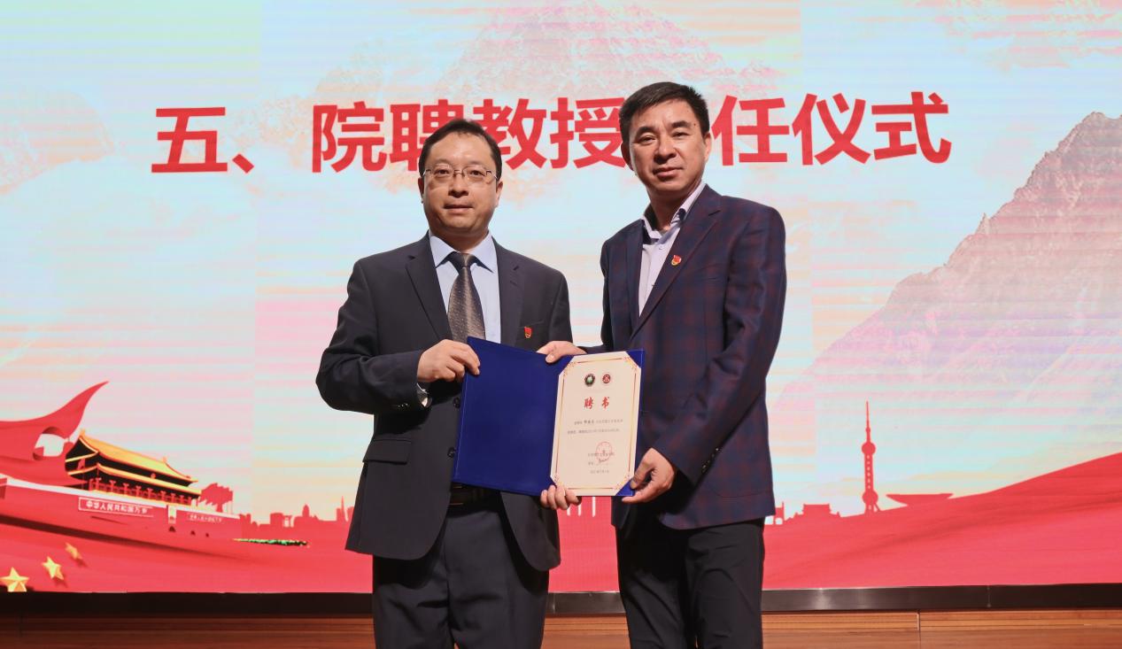随后,大会进行了院聘教授的聘任仪式,由院长李寿平为受聘教授郭德忠颁发聘书。