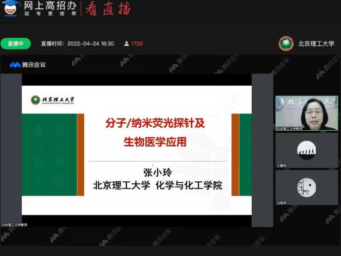 4月24日晚,甘肃招生组继续举办“理学与材料大类专业”专场宣讲会。化学与化工学院教授张小玲、数学与统计学院教授史福贵、生物医学工程系教授陈端端、甘肃招生组马晓龙共同通过网上高招办平台与考生和家长见面和答疑,约6000名家长、考生在线观看。