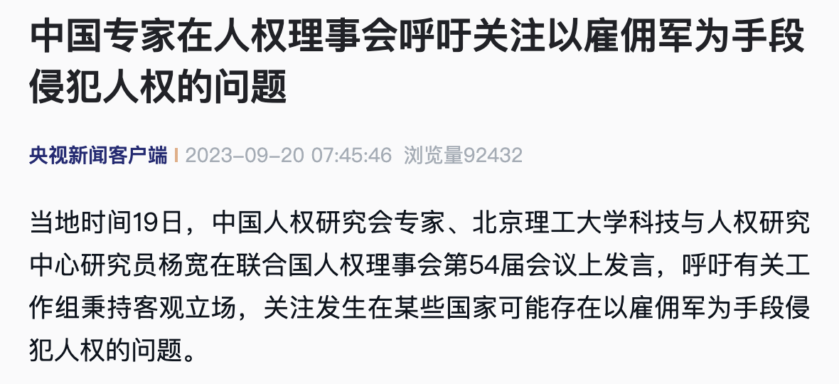当地时间19日,中国人权研究会专家、北京理工大学科技与人权研究中心研究员杨宽在联合国人权理事会第54届会议上发言,呼吁有关工作组秉持客观立场,关注发生在某些国家可能存在以雇佣军为手段侵犯人权的问题。
