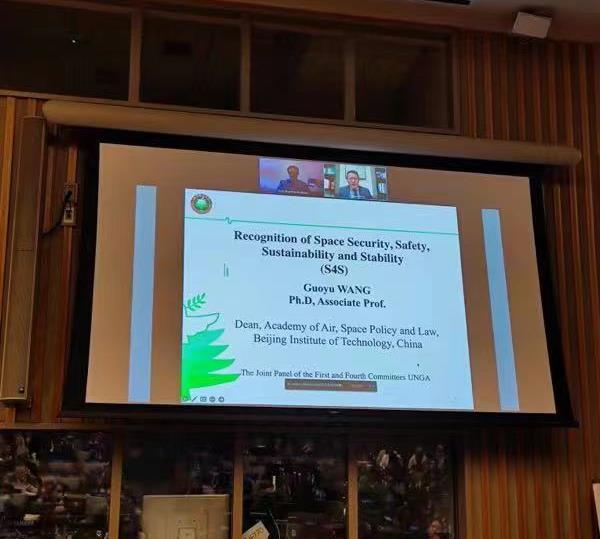 2022年10月27日,联合国大会第一委员会(裁军与国际安全)和第四委员会(特别政治和非殖民化)的联席会议在纽约联合国总部召开,本次会议主题是外空安全与可持续。法学院副教授王国语应联大一委、四委邀请作为国际空间法学界代表参加会议,并作主题为“如何准确识别外空安全、外空可持续和外空稳定内涵”的报告(视频连接:https://media.un.org/en/asset/k1t/k1tlgqbxx9)。自2015年召开首次一委四委联席会议以来,这是首次邀请非官方代表(两名来自国际空间法律政策学界、一名来自航天工业界)参加联系会议并作报告,另两位报告人分别是来自日内瓦安全政策中心的Nayef Al-Rodhan教授以及美国卫星工业协会的Jennifer Warren。