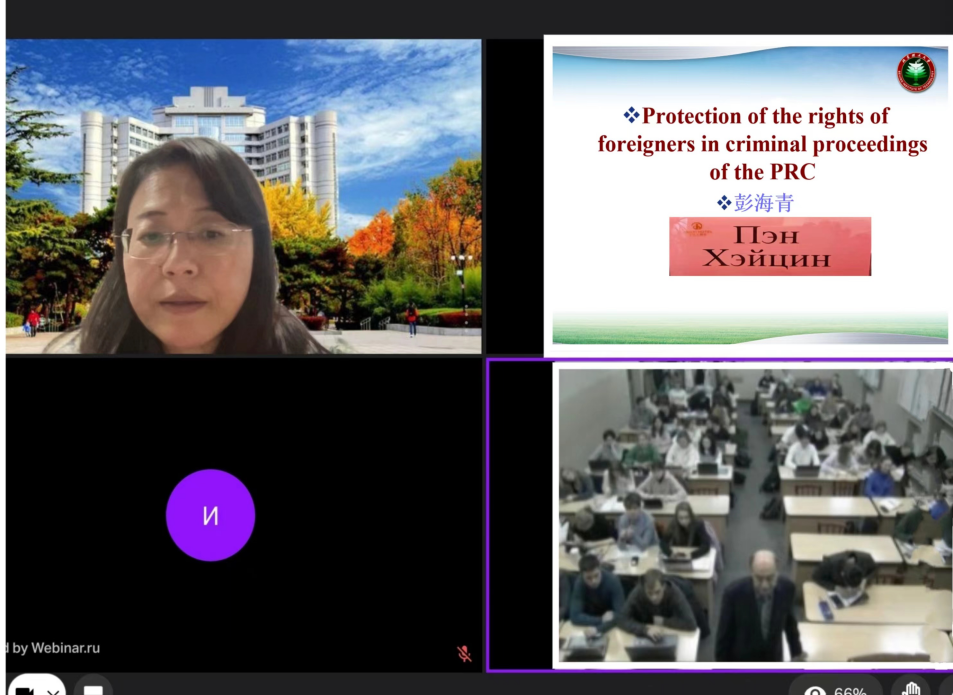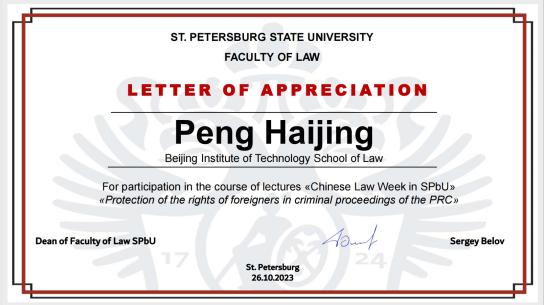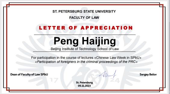我院彭海青教授于2023年10月26日和11月9日应邀为俄罗斯圣彼得堡国立大学法学院学生讲授了《中国刑事诉讼中对外国人权利的保护》和《中国刑事诉讼中外国人的参与》两场讲座。这两场讲座属于圣彼得堡国立大学“中国法周”系列讲座。