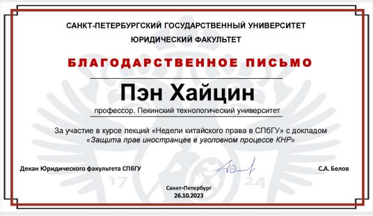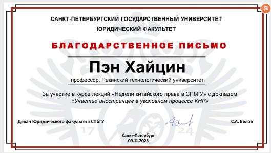 讲座结束后,2023年11月11日,圣彼得堡国立大学法学院院长Sergey Belov发来感谢函。
