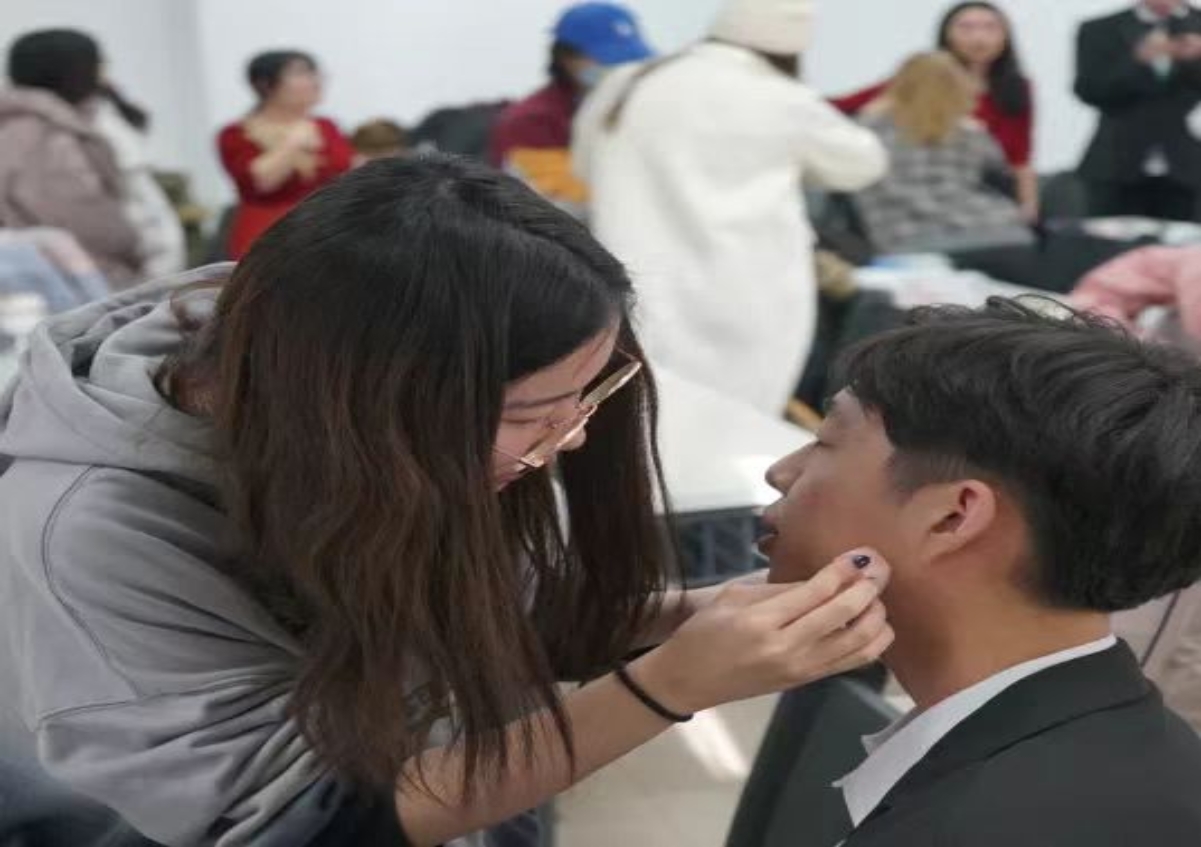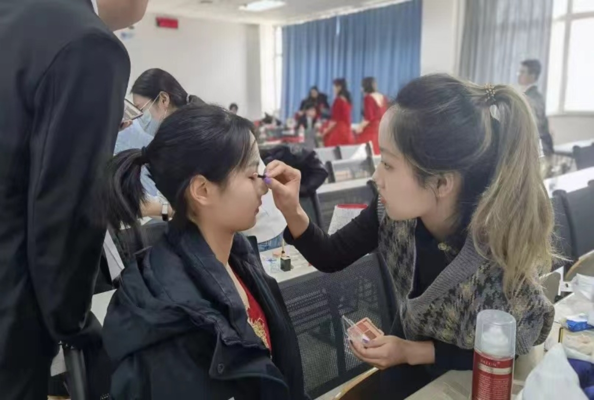比赛当天,合唱团的同学们早早来到教室,相信精致的妆容配上自信的笑容,同学们一定能够在舞台上展现出少年的朝气与活力,唱响新时代的华美乐章!