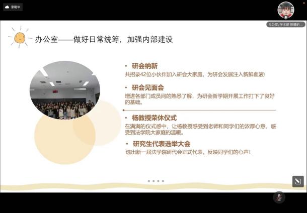 此次会议是法学院学生组织的一次阶段性工作总结。这一学期,法学院研究生会和法律援助中心在学院党委和团委的正确领导和悉心指导下,在各部门密切配合和全体成员的齐心努力下,携手奋进、开拓创新,取得了不错的成绩。在全新的2023年,研究生会和法律援助中心将更加努力做好各项工作,脚踏实地,全力以赴,不断前行,用热情、汗水和智慧书写法学院学生组织更加灿烂的篇章。