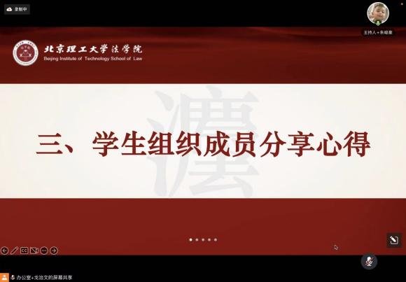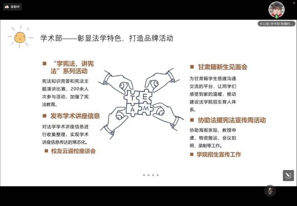法学院学生组织工作总结暨表彰大会于2022年12月30日在线上举办。法学院党委副书记副院长马晓龙、团委书记党莹、研究生会及法律援助中心的学生们参加了本次会议。会议由研究生会主席朱峻豪主持。