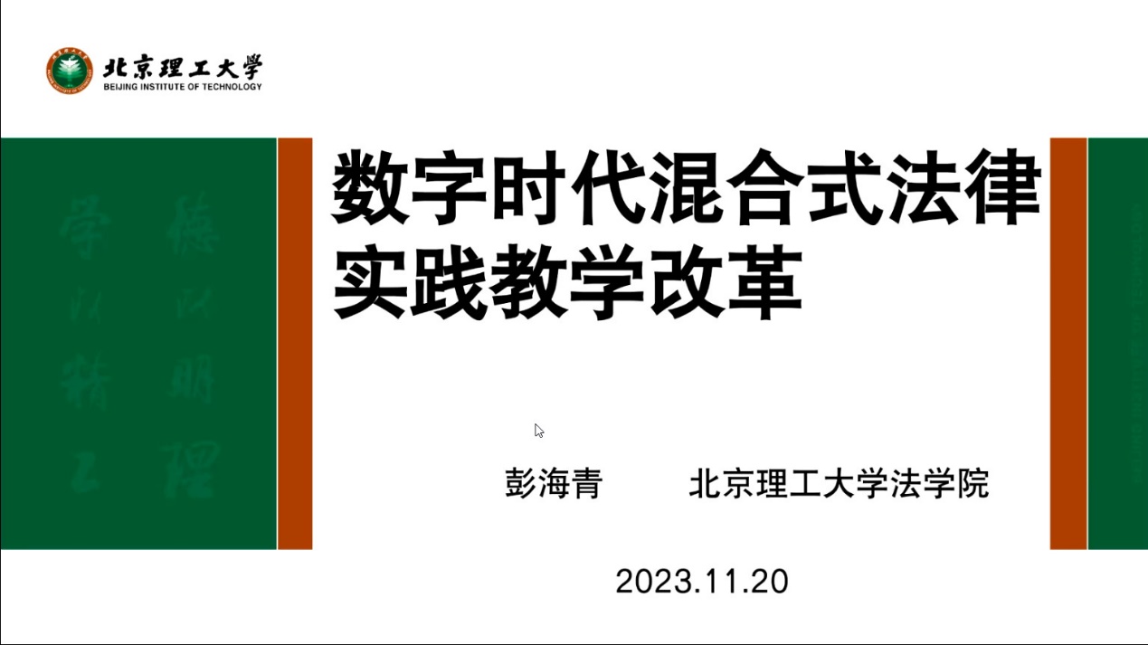 2023年11月29日上午,北京理工大学法学院举办了“数字时代混合式法律实践教学改革”专题讲座。由法学院国家一流课程负责人彭海青教授担任主讲人,来自我校法学院的20余位教师参加了此次活动。