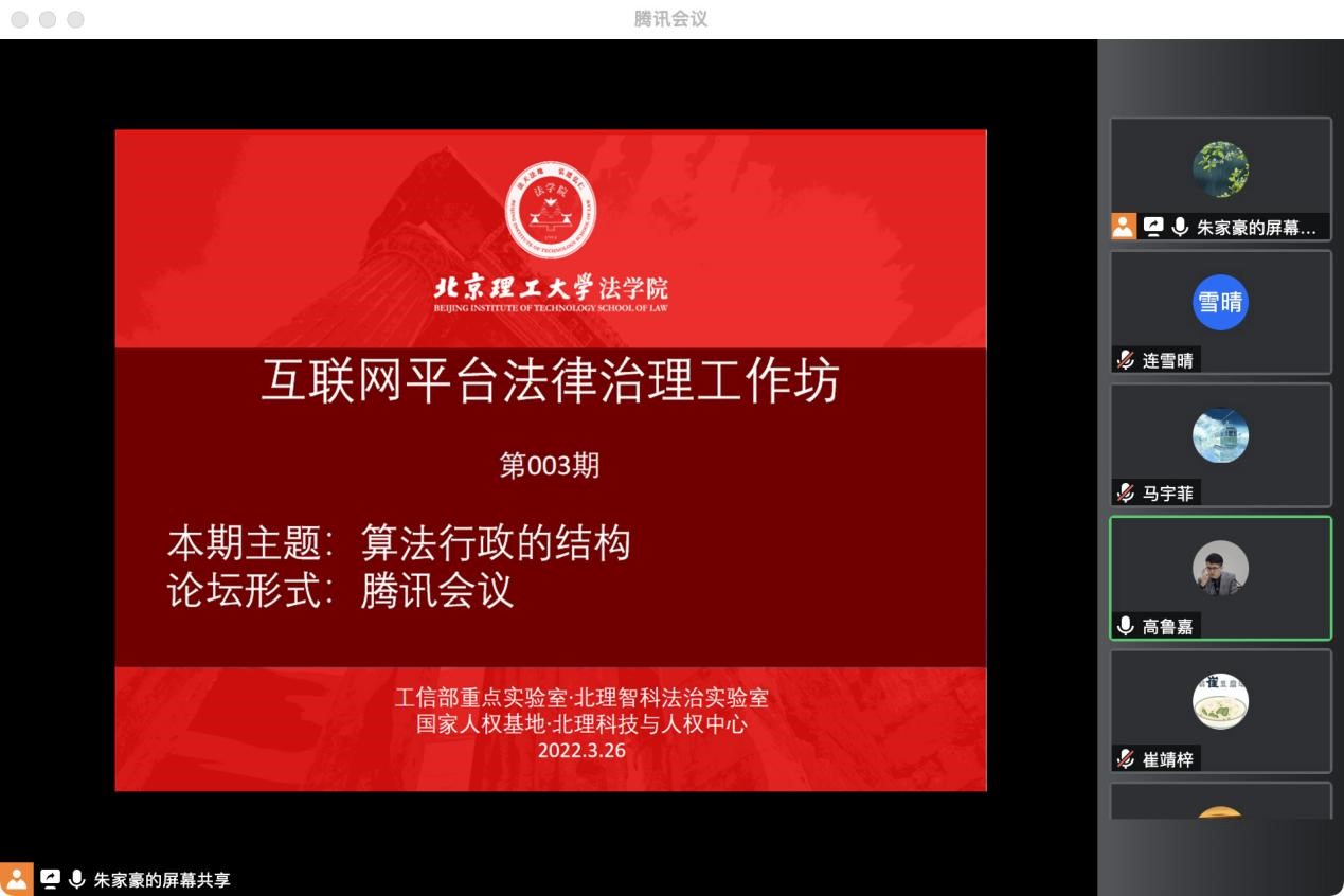 3月26日晚,由智能科技风险法律防控工信部重点实验室和国家人权教育与培训基地北京理工大学科技与人权研究中心共同主办的“互联网平台法律治理工作坊”第三期工作坊通过腾讯会议线上召开,本次会议的主题是“算法行政的结构”。