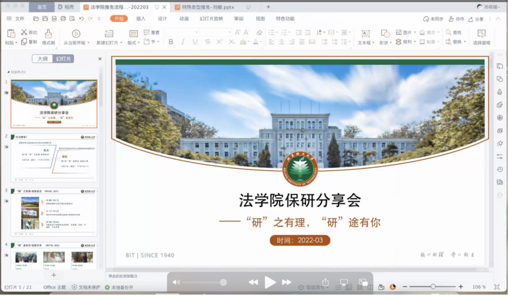 3月26日19:00-20:30,第一场“研”之有理分享会,由郭德忠副院长、本科教学干事杨佳美老师、辅导员刘敏老师进行往年推免政策宣讲与答疑;3月27日19:00-20:30,第二场“研”途有你分享会,由3名成功保研的优秀同学陈姜韬(保研至中国政法大学法学院)、张晶晶(保研至北京理工大学法学院)、王姝婷(保研至北京理工大学人文与社会科学学院)向大家介绍保研路上的相关经验,法学院19级、20级、21级本科生参加了此次活动。