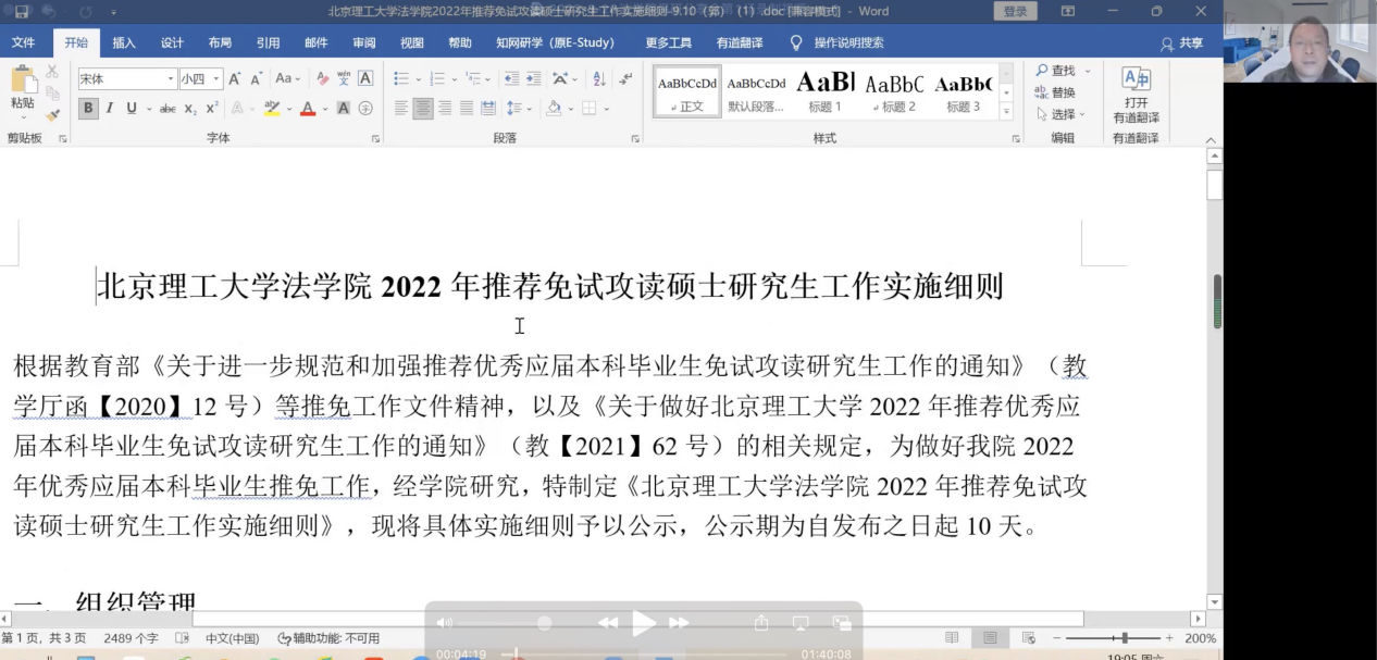 首先,郭德忠副院长对“北京理工大学法学院2022年推荐免试攻读硕士研究生工作实施细则“进行详细解读,帮助低年级学生了解保研的准备事项与申请程序及要求,同时激励学生提高学习积极性。