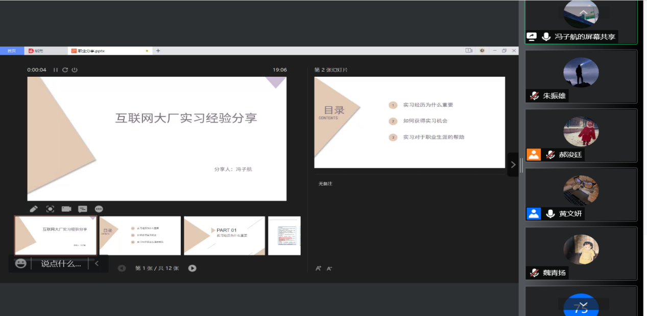 2020级法律(法学)专业的冯子航同学从互联网大厂实习必备要求、实习经历的重要性、获得实习机会的途径三方面分享了自己的实习经验。他强调,在大厂实习可以深入了解互联网产品的运行体系,有利于提升自己的横向能力。但互联网大厂可能会考察求职者的数据分析、内容创作与活动策划能力,以及过往是否有相似的实习经历,希望学弟学妹们可以早做打算,尽早开始有质量的实习。
