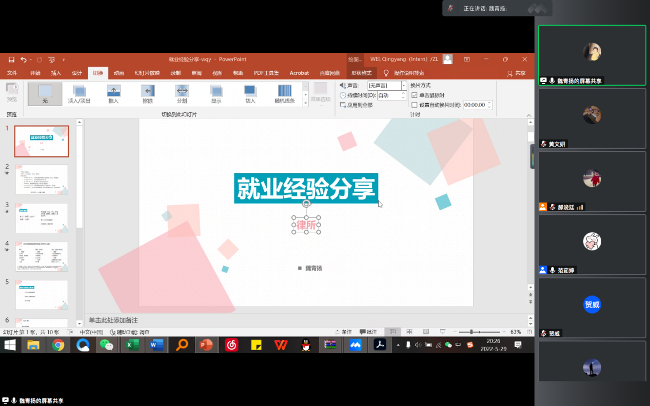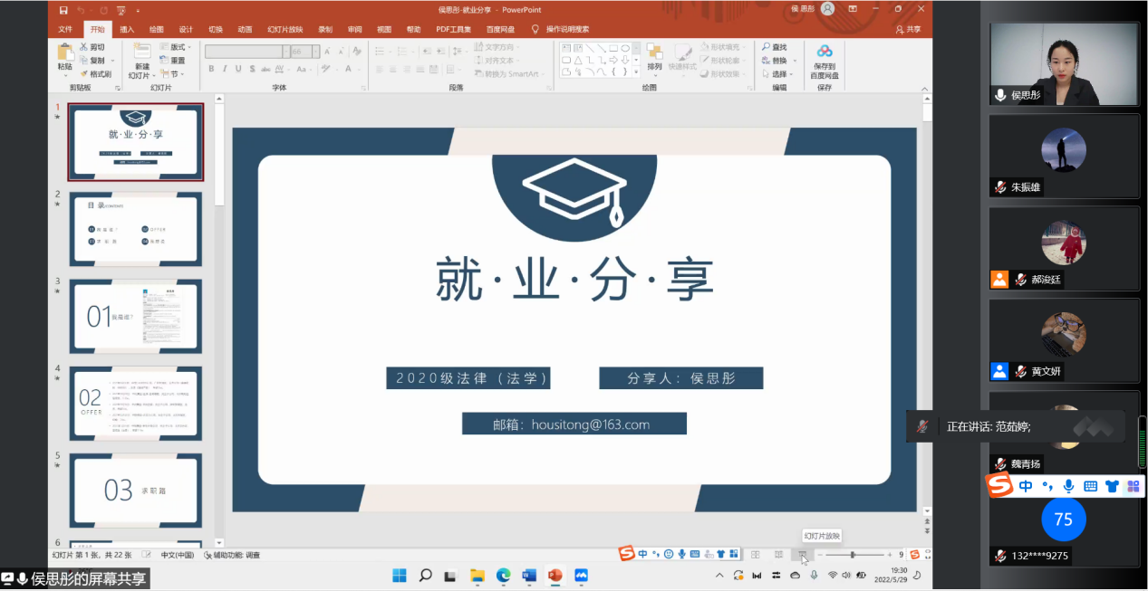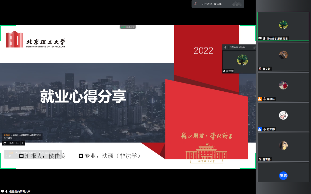 2022年5月29日晚,法学院研究生会举办了“职”等你来之企业、律所、高校场就业服务活动。本次活动积极响应学校疫情防控要求,采取线上腾讯会议的形式,邀请了六位学长学姐进行企业律所就业及博士升学经验分享,并对同学们关心的秋招、面试、实习、博士申请等多种问题进行了针对性的回答,旨在帮助同学明晰就业方向,规划发展道路,本次分享会峰值时吸引了九十名同学参与。