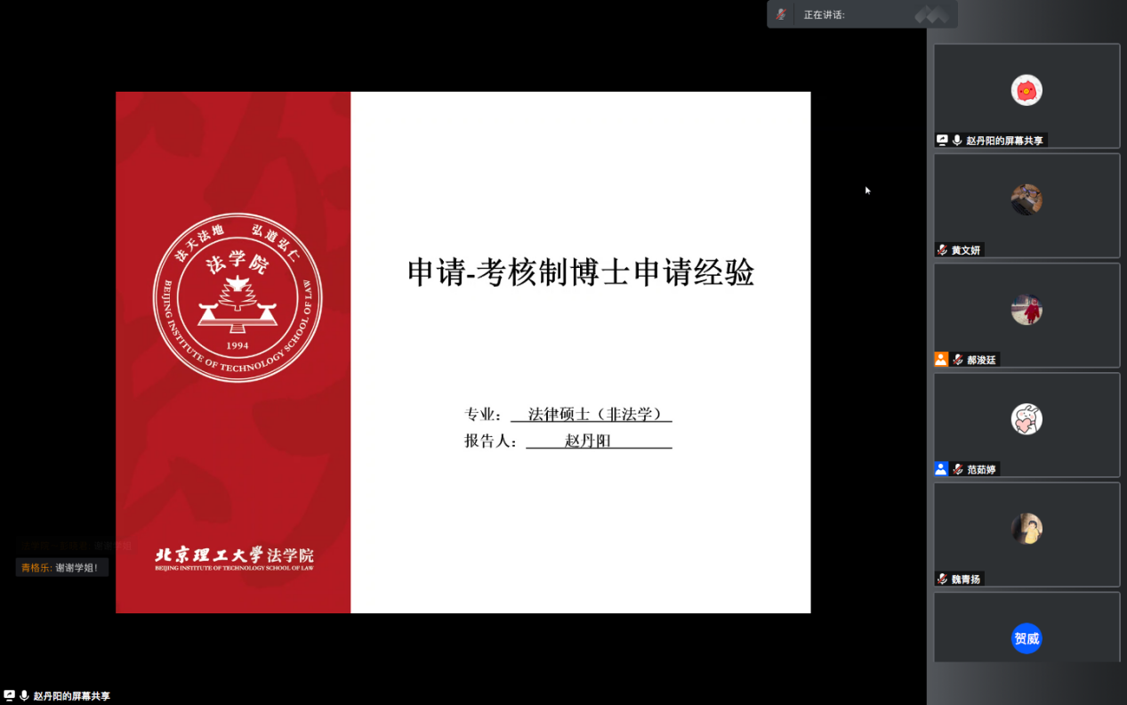 2019级法律(非法学)专业的赵丹阳同学从前期准备、正式申请与考试三个方面分享了考核制博士申请经验。赵丹阳同学建议准备申博的同学要尽早做好规划、努力发表论文,并针对论文发表期刊的选择、申请院校的选择、联系导师的方式以及笔面试的准备等问题分享了自己的经验。