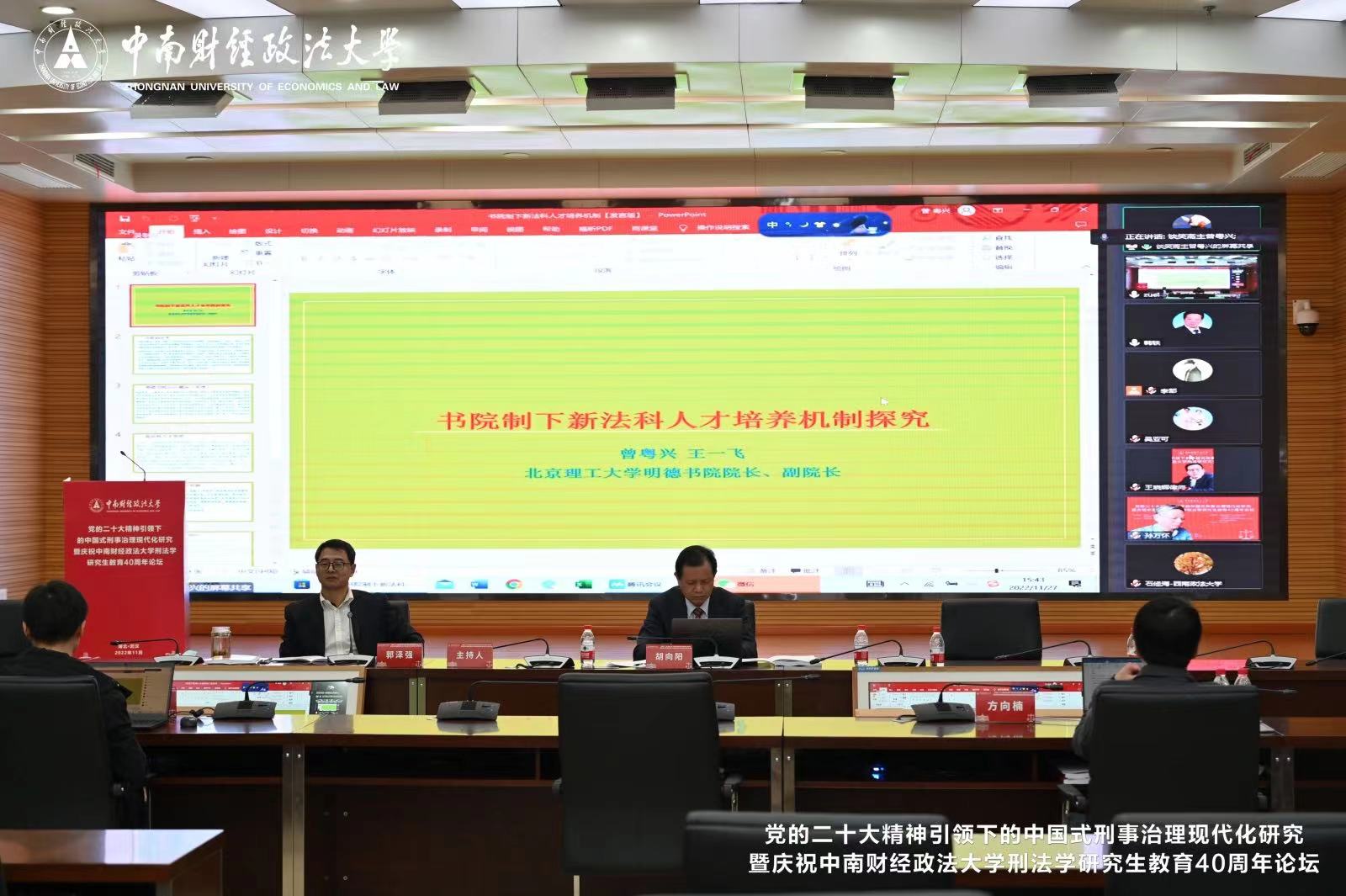 11月27日,党的二十大精神引领下的中国式刑事治理现代化研究暨庆祝中南财经政法大学刑法学研究生教育40周年论坛在湖北武汉召开,本次论坛由中国刑法学研究会、中国犯罪学学会指导,中南财经政法大学主办,中南财经政法大学刑事司法学院、中南财经政法大学法学院、中国犯罪学学会信息犯罪防控专业委员会承办。北京理工大学法学院教授、明德书院院长曾粤兴受邀参会并作主题发言。